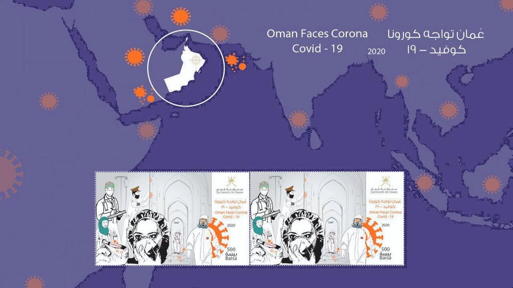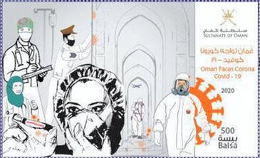 Sultanate of Oman issued a 500 Baisa stamp on 22 Jun 2020 on Covid 19 . The Slogan on stamp is “Oman Faces Corona Covid 19”