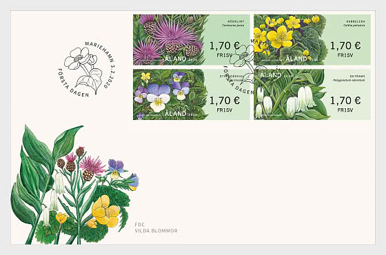 The franking labels feature the wildflowers Solomon’s seal (Polygonatum odoratum), wild pansy (Viola tricolor), brown knapweed (Centaurea jacea) and marsh-marigold (Caltha palustris), that can all be found anywhere in Åland