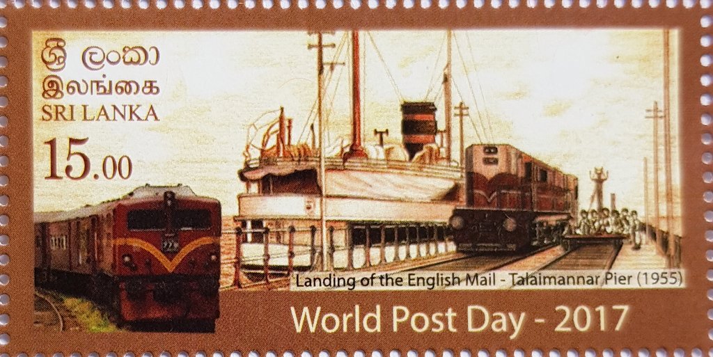 Sri Lanka issued a Rupees 15 Stamp featuring arrival of Mail from England at Talaimannar Port and then further being transported through Railway Mail.