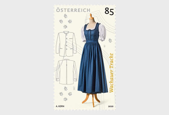 Austria issues stamps on the theme Traditional Costumes every year. The beautiful region of WachaU on the banks of Danube is the theme for 2020. The highly traditional everyday use costume for Women Indigo Printed Dirndi features on the 85 euro cent stamp issued on 03 Apr 2020.