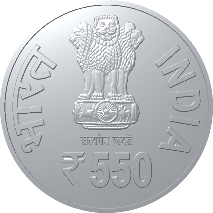 India Rupees 550 Coin – 35 grams , 44mm diameter Quaternary Alloy (Silver 50%, Copper 40%) Coin. It is non-circulating coin