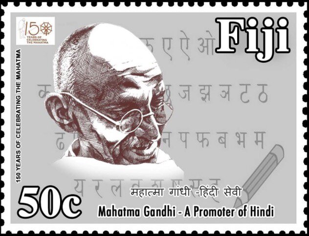 Fiji issued a set of Four Stamps to Commemorate 150th Birth Anniversary of Mahatma Gandhi on 20 Dec 2018. The 50c Stamp featured Gandhi as Promoter of Hindi. The Stamp of Fiji features Hindi Alphabets.