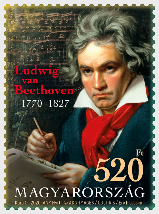 The stamp uses a reproduction of part of a painting showing Beethoven while composing the Missa Solemnis. The Missa Solemnis in D major , op.123, is a solemn mass composed by Beethoven in between 1819-1823 and is considered as one of his supreme achievements. In the background an extract of one of his manuscripts can be seen. An allegorical portrait of Beethoven appears on the first day cover.