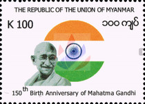 Myanmar issued Stamp to Commemorate 150th Birth Anniversary of Mahatma Gandhi on 02 Oct 2019. The 100 Kyat Stamp featured Gandhi and Indian Tricolor.