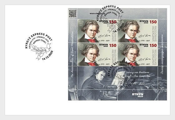 Kyrgyzstan issued a stamp to mark 250th Birth Anniversary of Ludwig van Beethoven. A First Day Cover is listed.