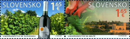 The stamp features a vineyard located in the limits of SiMalta while the Slovak stamp portrays a vineyard in the Skalica region renowned for production of the Skalicky rubin wine.