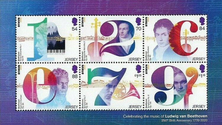 Jersey issued a set of Six stamps to Celebrate the Music of Ludwig Van Beethoven on his 250th Birth Anniversary. A Sheetlet was also issued on 26 Mar 2020.
