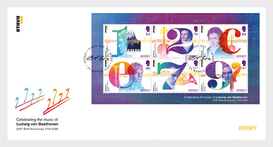 Jersey issued a set of Six stamps to Celebrate the Music of Ludwig Van Beethoven on his 250th Birth Anniversary. A Sheetlet was also issued on 26 Mar 2020.