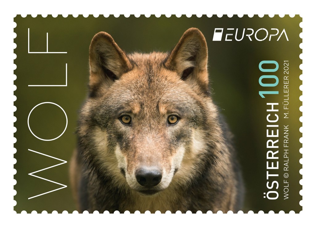 The theme of the 2021 EUROPE stamps is “Endangered national wildlife”, which is why Österreichische Post AG has chosen the wolf as the motif for this issue. Owing to intensive persecution, habitat destruction and the decline of its prey, the wolf had been considered extinct in Austria since 1882. However, the first wolves began to re-migrate from around 2009. Today, about 30 wolves live in Austria, mainly in Allensteig in Lower Austria’s Waldviertel region, in the Freiwald forest in the Mühlviertel region and in the border area with the Czech Republic.