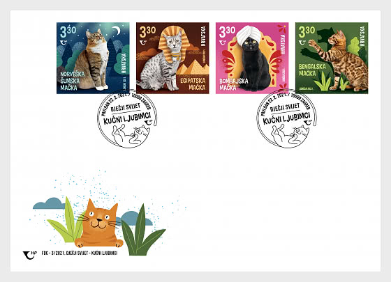 Croatia issued a set of Four stamps on Cats on 22 Feb 2021. A First Cover is Listed . The Cats featured are Bengal Cat , Bombay Cat , The egyptian Mau & The Norwegian Forest Cat