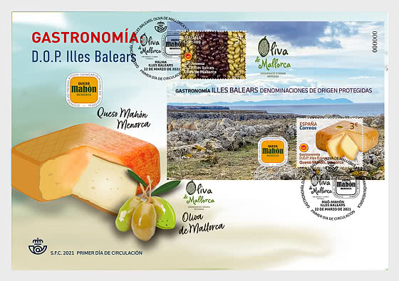 One of them has the Oliva de Mallorca as its protagonist. The second of the stamps includes an image of another of the islands delicacies, the Mahón Cheese, from Menorca