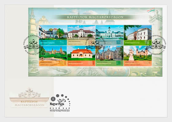 The background of the miniature sheet is composed of a montage of the exteriors, interiors and façades of the palaces. The first day cover and postmark feature an ornament from the façade of the Tisza Palace.