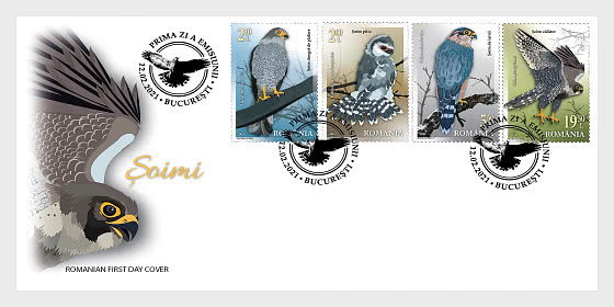 The Peregrine falcon (Falco peregrinus) is illustrated on the stamp with the face value of Lei 19.50 and on the First Day Cover of the issue. It is a large species (up to 120 cm in wingspan), widespread throughout the world.