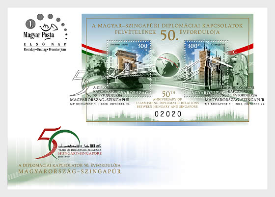 In 2020, the 50th anniversary of establishing diplomatic relations between Hungary and Singapore was celebrated. The occasion was marked by the postal services of the two countries jointly issuing a special souvenir sheet containing two stamps designed by the graphic artist Imre Benedek. Fifty thousand numbered copies of the Hungarian-issued souvenir sheet were produced by ANY Security Printing Company.