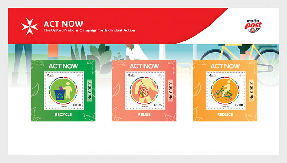This Malta stamp issue supports this campaign by encapsulating three separate symbols, one on each stamp; Reduce, Reuse and Recycle, also called the 3 Rs.