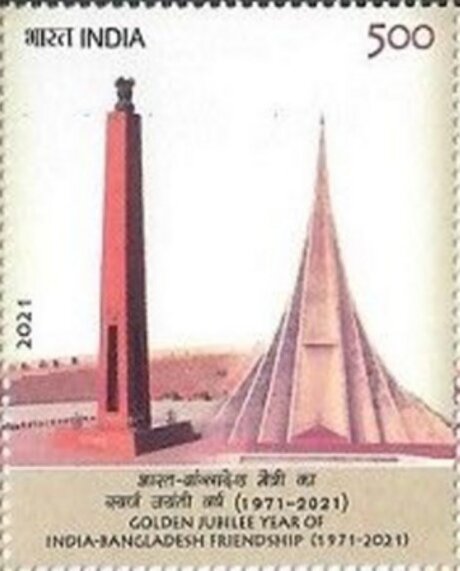 India issued a Five Rupees stamp on 27th Mar 2021 to mark 50th Anniversary of Diplomatic relations between India nad Bangladesh. The Stamp features Monuments.
