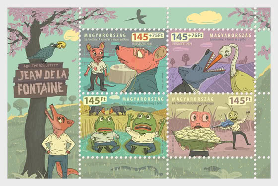 Magyar Posta commemorates the work of the French writer Jean De La Fontaine on the occasion of the 400th anniversary of his birth by issuing a special miniature sheet. Magyar Posta will use the amount of the surcharge to support the collection of stamps by youth. The special miniature sheet consisting of four stamps was produced by the ANY Biztonsági Nyomda Nyrt. in 20,000 copies, based on the plans of graphic artist Zsolt Vidák.