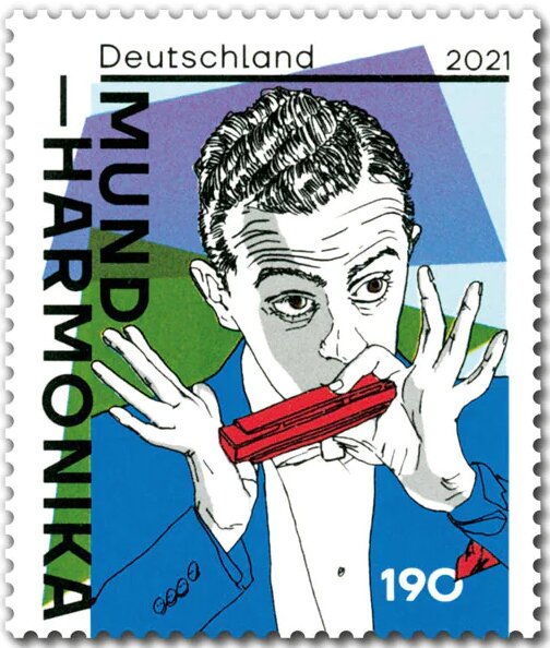 Germany issued a 190 euro cent stamp on The Harmonica on 01 Apr 2021. The Harmonica first came to Europe in early part of 19th Century. Christian Friedrich Ludwig Buschmann is often cited as the inventor of Harmonica in 1821. Other inventors also developed similar instruments around same time like Aeolina in 1829. It is also known as French harp or mouth organ and is a free reed wind instrument.