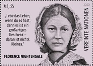 The Florence Nightingale stamp, in the denomination of € 1,35, was illustrated by Martin Mörck (Norway), designed by Rorie Katz (United Nations), and includes the following German quote: “Live life when you have it. Life is a splendid gift – there is nothing small about it.”