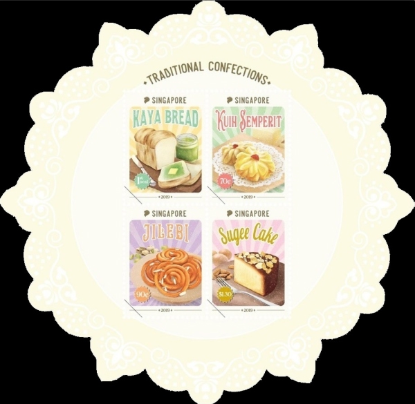 Singapore issued a Miniature sheet with four stamps on theme Traditional Confections. This 8$ Miniature sheet was issued on 17 Apr 2019 . Four confections featured on stamps are