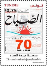 Tunisia issued a 0.75 Dinar stamp to mark 70th Anniversary of Al-Sabah Newspaper on 09 Feb 2021.