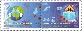 Algeria issued a Pair of Se-Tenant stamps on Campaign Against COVID 19 on 27 Feb 2021. Each stamp is of 25 Dinar. It features Health Workers , Vaccination , wash your hands , Do not shake hands etc.