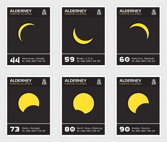 To mark the total solar eclipse on 21 August 2017, when all of North America were fortunate enough to witness an eclipse of the Sun, six coastal locations that will be treated to a partial eclipse, including Alderney. These specially produced heat sensitive stamps reveal information and full eclipses upon coming into contact with warm hands.
