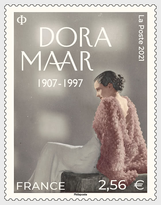 France issued a 2.56 Euro stamp on Dora Maar on 31 May 2021 . Henriette Thoedora Markovitch (2907-1997) was French Photographer, painter and Poet. She was depicted in many works of Pablo Picasso.
