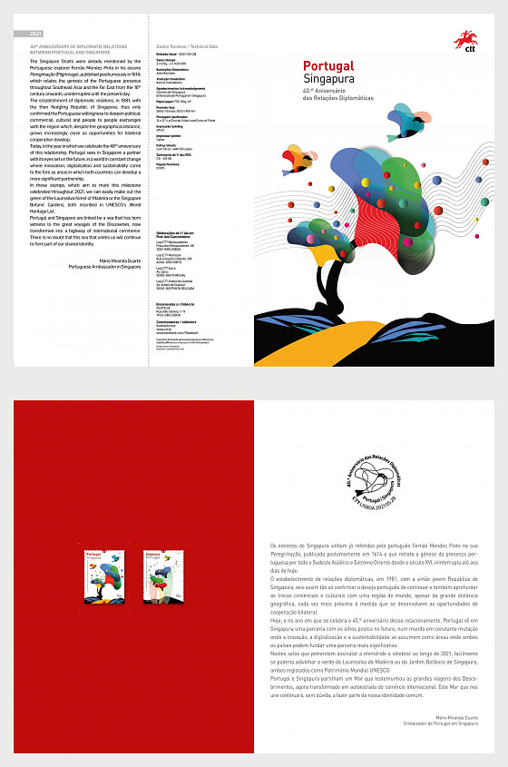 Singapore and Portugal celebrate 40 years of Diplomatic relations in 2021 . Portugal issued two stamps on 28th May 2021. Both stamps are I20g each.
