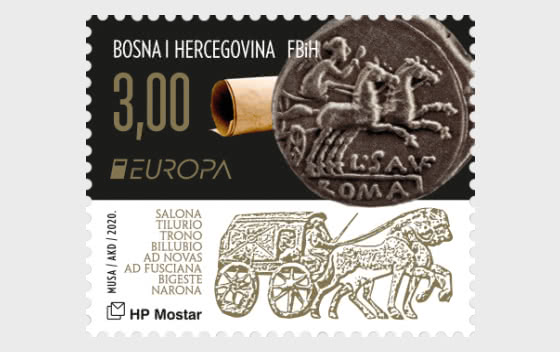 A wagon and a silver coin of the Roman consul L. Saufeius (152 BC) were chosen as motives on the stamps. On the reverse the coin shows Victoria driving a biga, and on the obverse the head of goddess Roma. The coin is located in the Franciscan museum of the Monastery of Saint Anthony in Humac, an area through which the very significant military road Salona (Solin) – Bigeste (Ljubuški) – Narona (Vid) has passed since the first century.