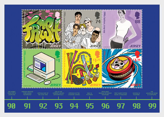 Jersey issued a Set of Six stamps , One souvenir Sheet and a Miniature Sheet on Popular Culture of 90s.