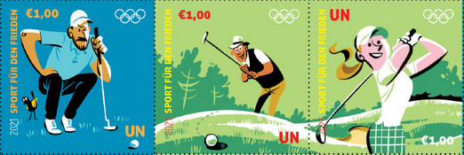 UNPA Vienna issued a set of three stamps in Se-tenant strip on 23 Jul 2021 to commemorate #2020Tokyo Olympics. Each stamp is 0.85 Euro and thre are eight stamps in a Miniature sheet with Print run of 56,000. The Stamps feature Golf.
