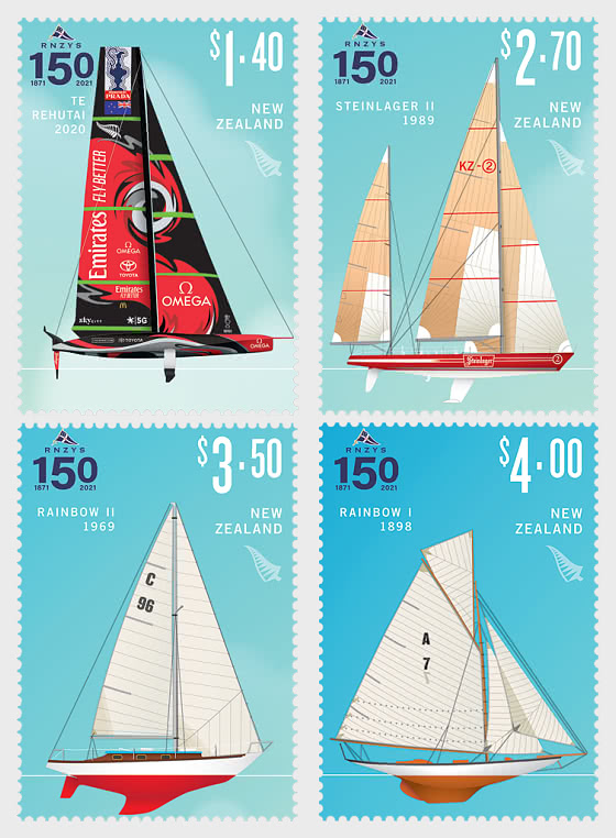 Over its 150-year history, the Royal New Zealand Yacht Squadron (RNZYS) has kept pace with astonishing developments in yacht design and technology, from the wood-and-cotton era through to the space-age carbon-fibre and titanium materials in use today. In honour of this anniversary, this stamp issue celebrates four of New Zealand’s key competitive yachts.