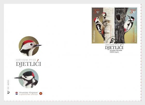 Motifs: the middle-spotted woodpecker (Dendrocoptes medius), the white-winged woodpecker (Dendrocopos leucopterus). The stamps were issued in a common 8-stamp sheetlet and Croatian Post has also issued a First Day Cover (FDC).