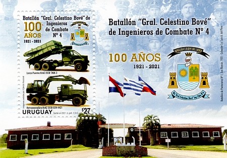 Uruguay issued a Miniature sheet with two stamps on 27 Oct 2021 to mark centenary of Celestino Bové Combat Engineer Batallion Number 4. It features Trucks and Combat Engineer Vehicles. Print run 5000