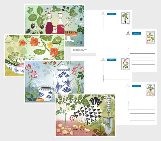 Four savoury postal stationery cards celebrate spring. The cards were inspired by the Åland Spring Fair highlighting small-scale farming, sustainability, and local production. The postage-paid-symbols on the address side of the cards relate to the decorative motif of each card. Postage is included in the price and the cards may be posted from Åland to any destination in the world without additional postage