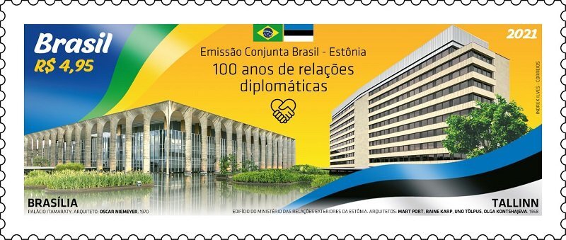 Estonia and Brazil are jointly issuing stamps to celebrate the 100th anniversary of the diplomatic relations between the two countries. The stamp features the Itamaraty Palace in Brasília which was designed by the world-famous architect Oscar Niemeyer and houses the Ministry of Foreign Affairs of Brazil, as well as the building of the Estonian Ministry of Foreign Affairs in Tallinn, designed by the architects Mart Port, Raine Karp, Uno Tölpus, and Olga Kontšajeva.Even though the two buildings are separated by more than 10,500 km, they are connected, in addition to the warm relations, by their green and beautiful surroundings, which are referred to in the design of the stamps. The colourful and joyous design symbolises the multi-layered cultures and the rich nature of the countries. The national flags waving in the lively samba rhythm add to the festive mood of the stamps.