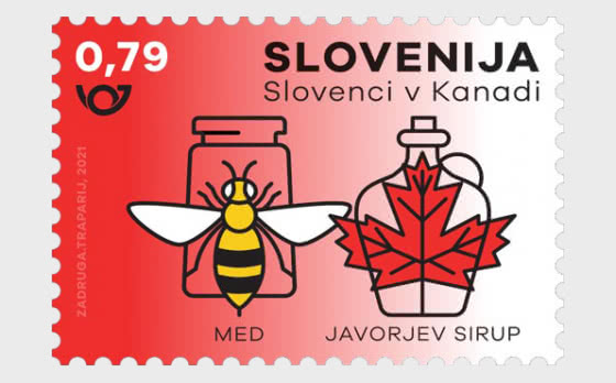 In the 1920s Slovene immigrants began to club together in societies and associations that continue to maintain contacts with the homeland even today. The stamp shows two symbolic foodstuffs of Canada and Slovenia: maple syrup and Slovene honey.