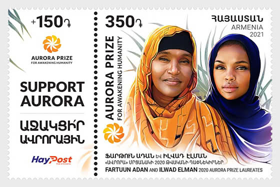 On December 9th, 2021, a postage stamp dedicated to the theme “Aurora Humanitarian Initiative. Laureates of “Aurora” Prize. Fartuun Adan and Ilwad Elman” has been cancelled and put into circulation.