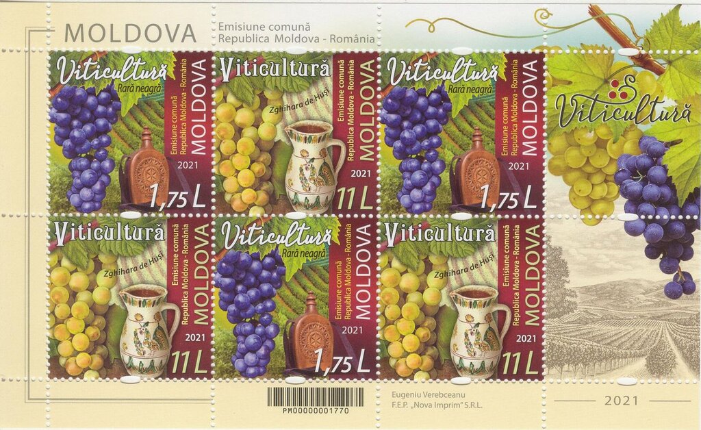 The stamp with a face value of 11 Moldoval Leu brings together in a unitary graphic the image of a painted cup that was made by the craftsman Colibaba Constantin, in the Radauti Urban Workshop, Suceava County, and of a bunch of Zghihara grapes from Husi region, Romania.