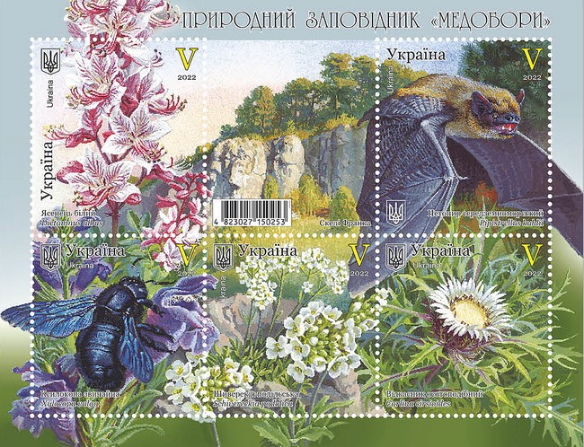 Ukraine issued a Miniature Sheet containing Five stamps on Medobory Nature Reserve on 25 Feb 2022. All are V -No Face Vlaue stamps. The Medobory Nature reserve is located in Western Part of Ukraine in Podollan Upland and is home biodiverse forests and limestone cliffs.