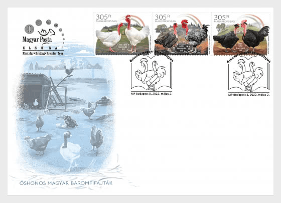 In 2022 Magyar Posta is starting a new series called Indigenous Hungarian Poultry Breeds, which, based on the plans, is intended to present a different poultry breed annually over a number of years. In 2022, the white Transylvanian naked neck chicken, the speckled Transylvanian naked neck chicken and the black Transylvanian naked neck chicken appear on the stamps. The strip of three stamps designed by the graphic artist Ágnes Berta were produced by ANY Security Printing Company. .