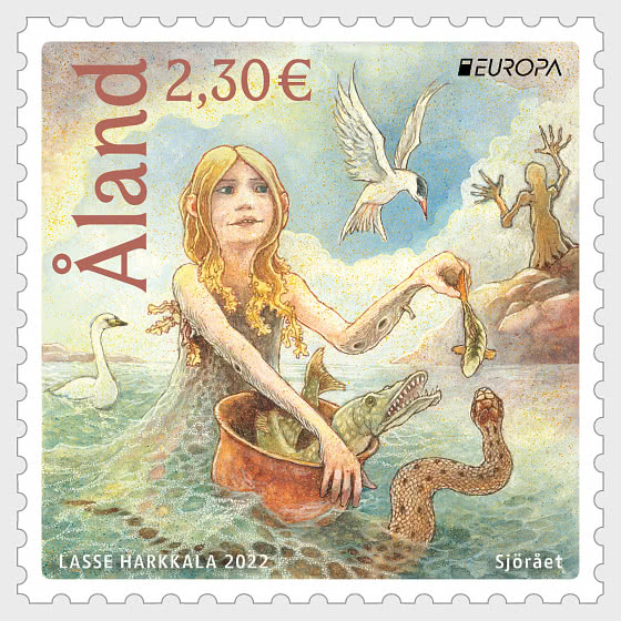 On 9 May, Åland Post issues the annual stamp in the Pos- tEurop Europa stamp series. The 2022 theme is stories and myths, and the Åland stamp shows the “sjörå”, a female water spirit according to Åland folklore. Illustrator Lasse Harkkala is responsible for the interpretation. “The stories about the sjörå were inspiring and appealing because the figure is unpredictable and uncontrollably primitive; you don’t know if it’ll contribute to fortunate events or cause sorrows, and the uncertainty is both frightening and attractive to us humans.”
