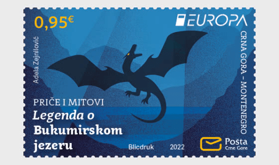 The legend of Bukumir Lake tells of an Illyrian tribe that inhabited the area of today’s Kuči, near the city of Podgorica.The tribe opposed the evil dragon from the lake by setting fire to a pile of trees on a nearby rock. When the rock glowed with heat, they threw it into the lake, which boiled. A man on a white horse jumped out of the lake and cast a curse on Bukumiri to mutually exterminate themselves. The curse came true, and only stones remained around the lake, the so-called kiljans, in memory as a remembrance of Bukumiri. Montenegro issued a 0.95 Euro stamp on 24 Jun 2022.