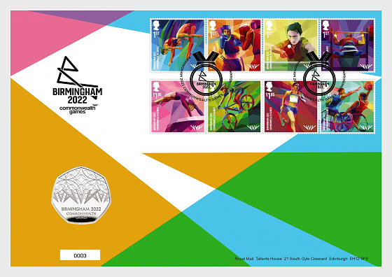 The set of eight stamps have a distinctive design showcasing eight exciting sports including para sports, which are integrated into the main Games rather than a separate Para event afterwards. All the products carry the official Games logo hologram. We have also collaborated with The Royal Mint to produce a coin cover featuring both the official Stamps and 50p Coin of the 2022 Commonwealth Games.