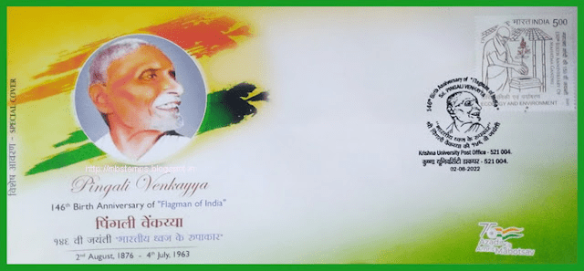 A Special cover was released on 02 Aug 2022 on Pingali Venkayya , The Flagman of India at Krishna University Post Office. It was his 146th Birth Anniversary (2 Aug 1876- 4 July 1963).