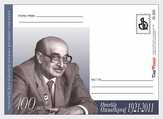 On November 26th, 2021 a special postcard dedicated to the 100th Anniversary of Suren Arakelov has been cancelled with a special postmark within the framework of the Republican Philatelic Exhibition organized by the Armenian Association of Philatelists. The left part of the postcard depicts famous philatelist Suren Arakelov, who held the position of the Honorary President of the Union of Philatelists of Armenia from 1975 to 2011. The postcard also depicts the inscriptions “100th anniversary” and “Suren Arakelov 1921-2011” in Armenian language. The upper right corner of the postcard depicts the logotype of the Armenian Association of Philatelists.