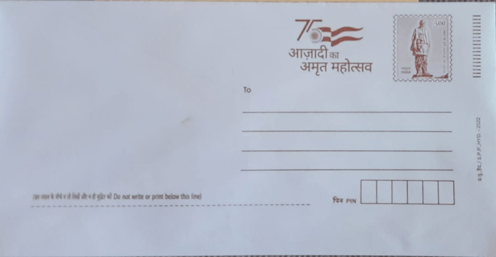 A New Rupees Five Pre Stamped Envelope has been released by SPP Hyderabad to mark 75Years of Independence with slogan Azadi ka Amrit Mahotsav. The stamp design features Statue of Unity and Sardar Patel.