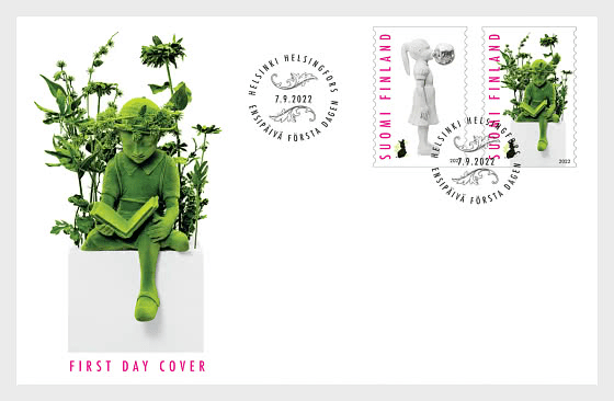 Posti’s art award for 2022 was presented in April to sculptor Kim Simonsson, whose two sculptures will now be featured on stamps.The stamps showcase Kim Simonsson’s sculptures from 2008 and 2022. “On one of the stamps, we’ll see the Bubblegum Girl painted in white, who blows a bubble of bubblegum made of silvered glass with her superpowers. The other stamp will introduce the Sleeping Reading Moss Girl, in which a girl has fallen asleep while reading,” says the artist himself in describing the stamp.