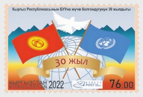 Kyrgyzstan issued a 76 som stamp in May 2022 to commemorate 30th Anniversary of Joining United Nations.
